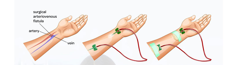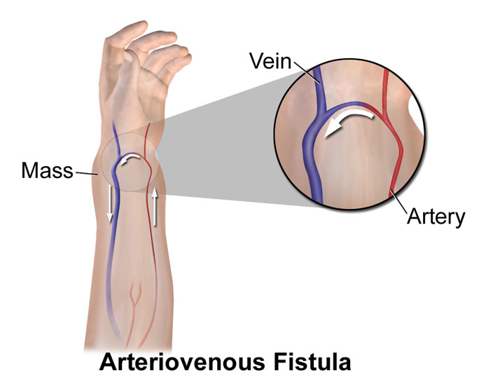 في هذه العملية يتم توصيل الوريد السطحي الذي يمر تحت الجلد يتم توصيله بالشريان القريب منه بهدف زيادة تدفق الدم الشرياني داخل الوريد و بالتالي يمكن استعماله من خلال خراطيم ماكينة الغسيل الكلوي التي تنقي هذا الدم.